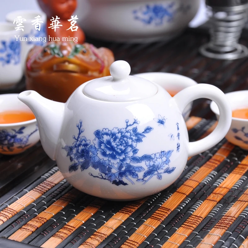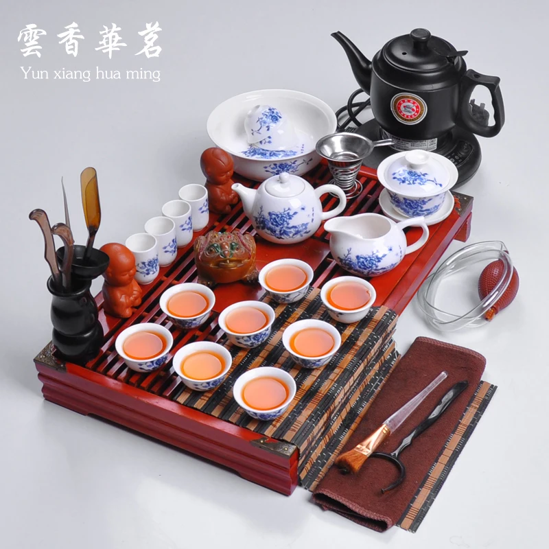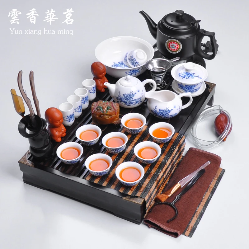 The blue and white porcelain of Kung Fu tea set ceramic teapot tea tray wood tea set table